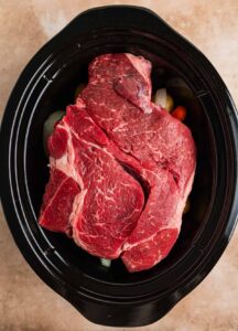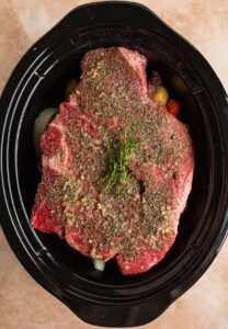 - Layer the crockpot: Add onions, carrots, and potatoes to the bottom. Place the roast on top.