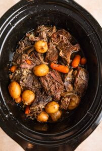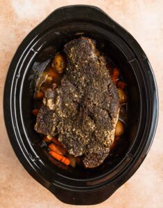 - Cook: Cover and cook on low for 8–10 hours or high for 5–6 hours, until beef is fork-tender.