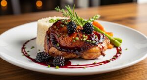 Plate the chicken with a generous drizzle of the blackberry glaze and garnish with fresh thyme or a few whole blackberries for visual appeal.