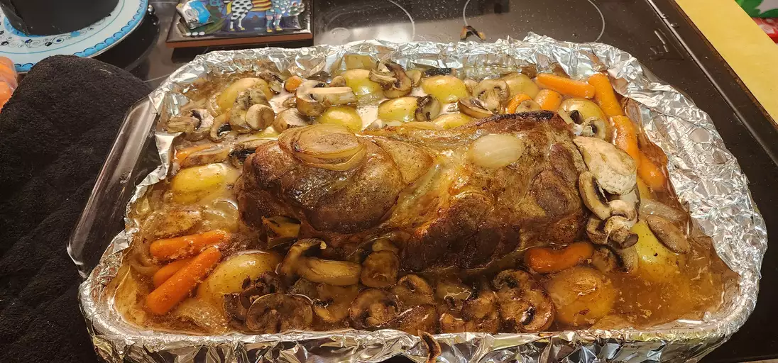 Layer the vegetables – Place potatoes, carrots, onions, and celery in the bottom of a crockpot or baking dish. Add garlic and herbs.