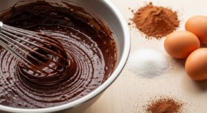 Beat in the eggs one at a time, followed by the vanilla extract. Next, sift in the cocoa powder, all-purpose flour, salt, and baking powder.
