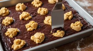 You can gently press them down or lightly spread the dough to cover more surface, but don’t worry about making it perfectly smooth—some brownie batter peeking through will give the finished brookies a beautiful marbled look.