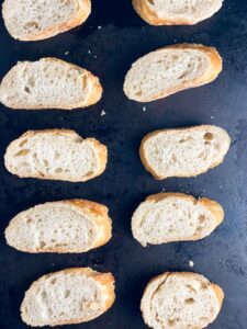 Bread – Generally crostini is made with a sliced baguette, but you can use your favorite style of bread. I recommend if using a sandwich bread to at least slice in half and trim the crust for a more elegant look. However, if you’re just eating at home, it’s great as a toast.