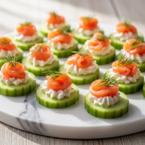 Cool and refreshing — cucumber slices topped with cream cheese and smoked salmon.