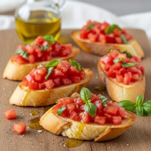 A light Italian favorite — toasted baguette slices topped with garlicky tomato mix.