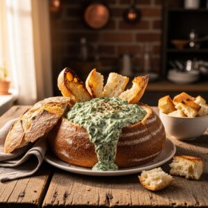 Creamy spinach dip baked inside a crusty bread loaf — warm, cheesy, and crowd-pleasing.