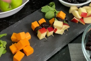 Crisp apple slices paired with cubes of sharp cheddar cheese create a refreshing yet comforting flavor combination.