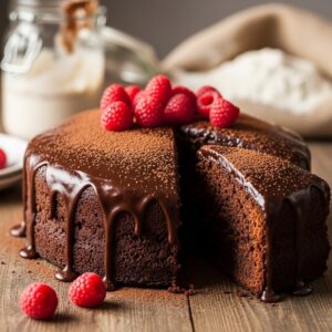 A rich and moist chocolate cake with a subtle tangy undertone.