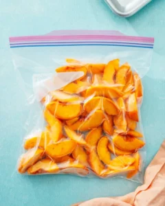 Once frozen, transfer the peaches into freezer-safe zip-top bags or containers.