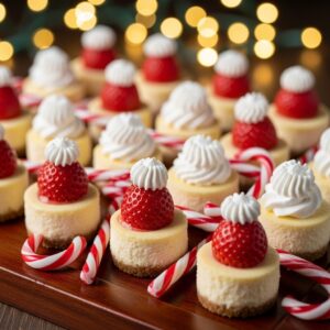 Spoon cheesecake filling onto vanilla wafer bases, then top each one with a strawberry and a dab of whipped cream to create Santa’s hat.