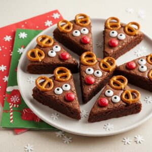 Cut brownies into triangles, use pretzels for antlers, candy eyes, and a red M&M for the nose.