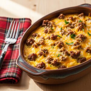 Layer hash browns, sausage, cheese, and eggs in a baking dish and let it bake while you open gifts.