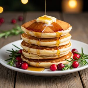 Add cocoa powder to your pancake mix, drizzle with chocolate syrup, and top with crushed peppermint candies and whipped cream for a Christmas-morning delight.