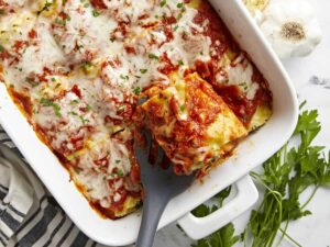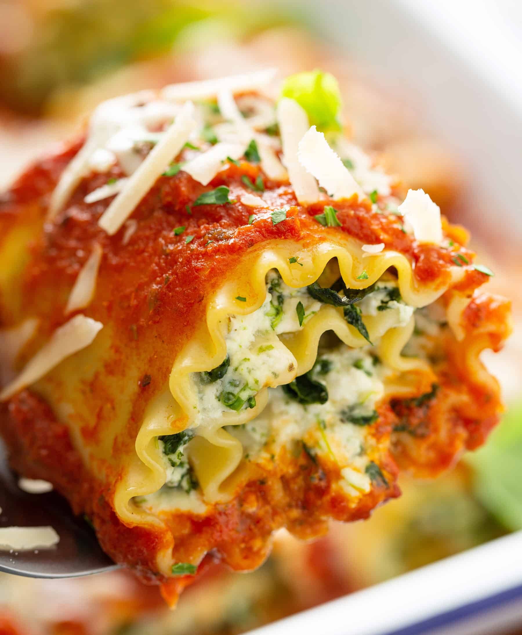 Rolling the lasagna noodles makes portion control and serving a breeze, while also creating an attractive presentation.