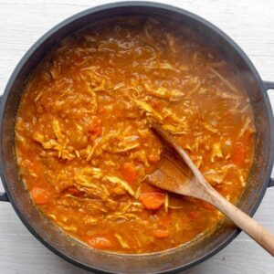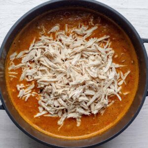 - Stir in shredded chicken, diced tomatoes, and bay leaf. Simmer for another 10–15 minutes.