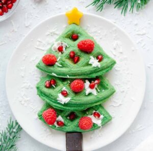 Stack them in a triangular form, dust with powdered sugar for a “snowy” effect, and decorate with berries or mini chocolates as ornaments.