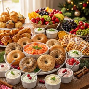 A brunch charcuterie board can include smoked salmon, cream cheese, bagels, waffles, fruit, and mini pastries.