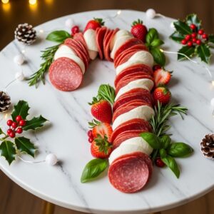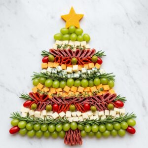 Use layers of green grapes, cucumber slices, or rosemary sprigs for the “tree,” then layer meats, cheeses, and fruits in stripes to mimic ornaments.