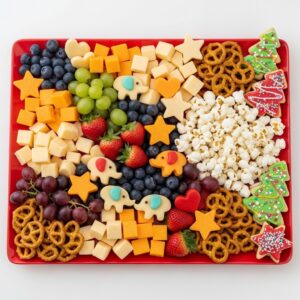 Think cheese cubes, mini sandwiches, popcorn, pretzels, fruit slices, and Christmas cookies.