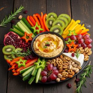 Add festive items like red bell peppers, cherry tomatoes, and green cucumbers for holiday color.