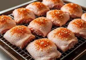 Place the thighs skin-side up on a wire rack set over a baking sheet. This allows heat to circulate underneath and helps the skin crisp up evenly.