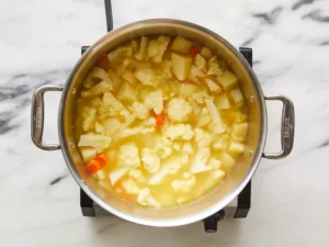 - Cook Cauliflower: Add cauliflower florets and broth. Bring to a boil, then reduce heat and simmer for 15–20 minutes until cauliflower is tender.