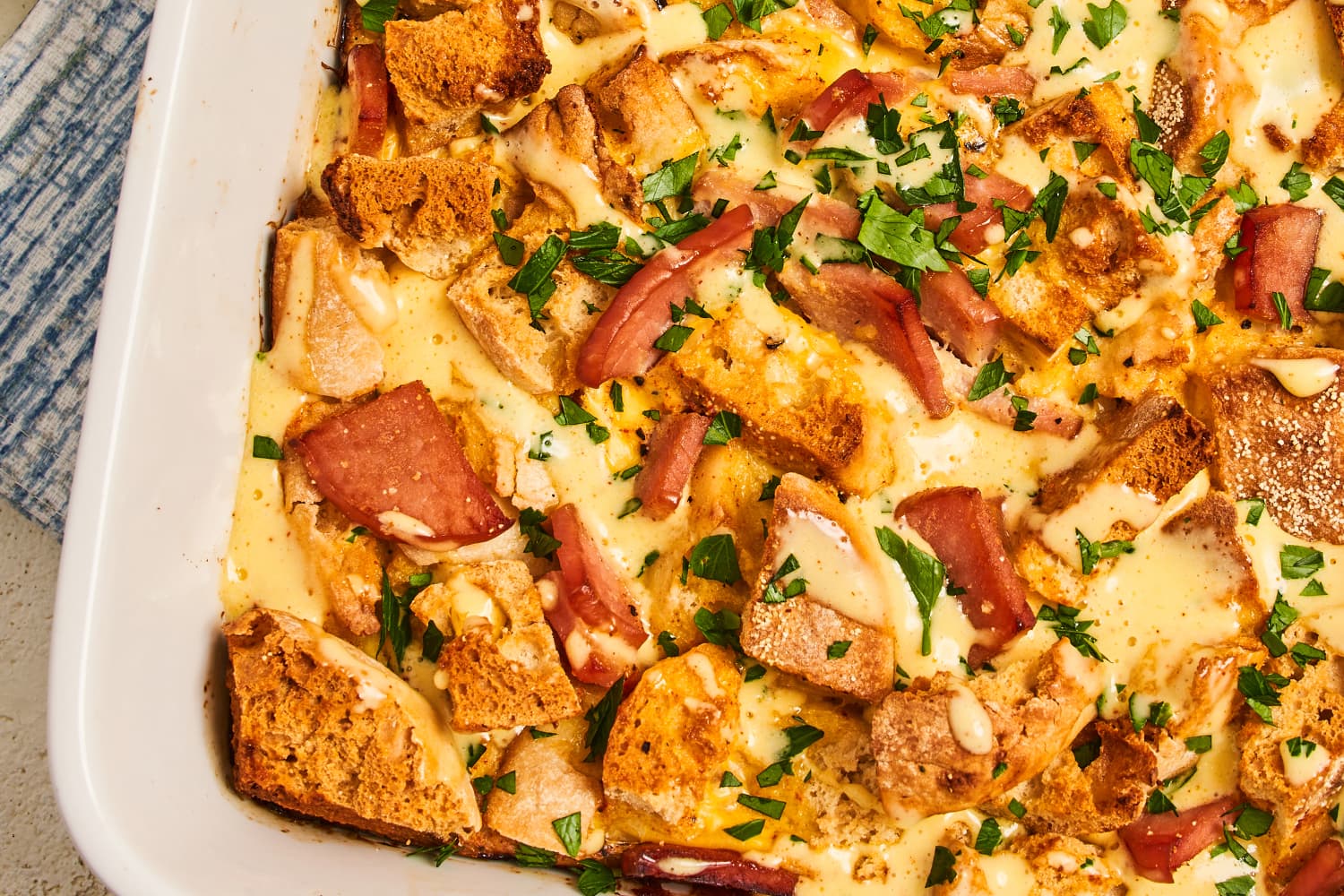 Yes! While letting it sit overnight helps the flavors meld and the bread soak up the egg mixture, you can bake it the same day. Just let it rest in the fridge for at least 30–60 minutes before baking.