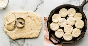 7. Slice biscuits, layer with strawberries and whipped cream.