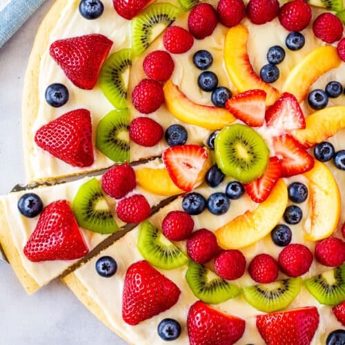Store leftover fruit pizza in an airtight container in the fridge for up to 2 days. The crust might get a little softer, but it’ll still taste great.