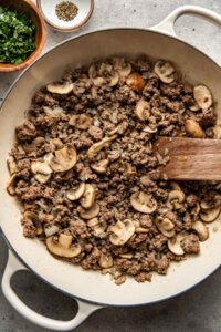 - Add beef & flavorings: Stir in Worcestershire sauce, Dijon mustard, and the cooked ground beef. Simmer for about 5 minutes.