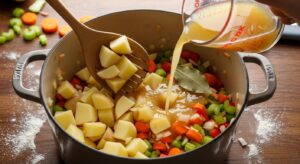 Once the potatoes are tender and the creamy base is ready, remove the bay leaf from the potato mixture. Gently pour the creamy roux mixture into the main pot, stirring to combine everything into a luscious, thick soup.