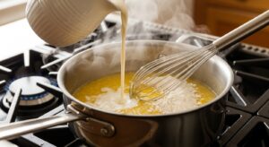 Continue whisking until the mixture thickens slightly, about 3–5 minutes. Keep the heat on low to medium to prevent scorching.