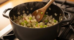 At this stage, the aroma should be rich and savory — the perfect foundation for your chowder.