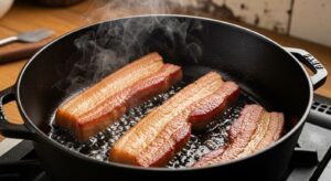 Let the bacon render its fat slowly, turning occasionally, until it becomes deep golden and crispy, about 5–7 minutes.