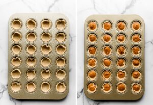 - Fit the dough rounds into your mini muffin pan: Grease a mini muffin pan. Press the dough flat into the bottom of the crevice and up the sides.