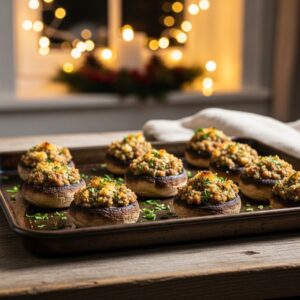 Tender mushrooms stuffed with sausage, breadcrumbs, and herbs make a delicious, savory appetizer that’s easy to prep ahead.