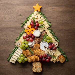 Arrange different cheeses, crackers, and grapes in the shape of a Christmas tree on a large platter.