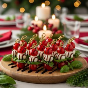 Simply layer cherry tomatoes, mozzarella balls, and basil leaves on small sticks, then drizzle with balsamic glaze.