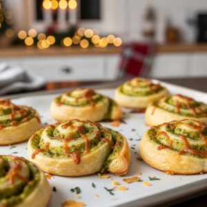 Puff pastry pinwheels filled with pesto and cheese are crispy, buttery, and easy to bake in large batches.