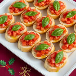 Crisp toasted baguette slices topped with diced tomatoes, olive oil, garlic, and fresh basil create a fresh and flavorful appetizer.