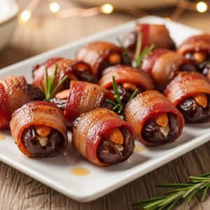 Wrap dates in bacon, secure with a toothpick, and bake until crispy.