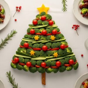 For a healthy and festive option, arrange broccoli florets, cucumber slices, and cherry tomatoes in the shape of a Christmas tree.