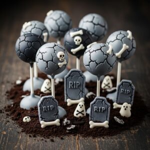 Dip cake pops in gray or black candy coating and use edible markers to draw cracks, bones, and mini gravestone shapes.