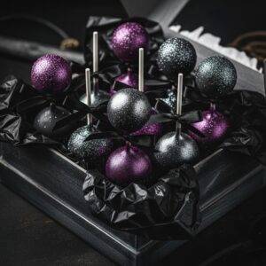 Dip cake pops in black or deep purple candy melts, then dust them with edible shimmer or black glitter.