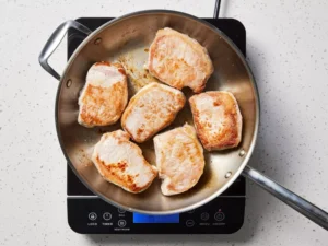 2. Heat olive oil in a skillet and brown the pork chops on both sides (about 3 minutes per side).