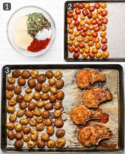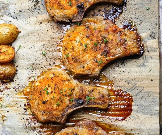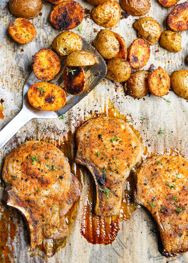 Bake for 35–40 minutes, flipping the chops halfway through, until the pork reaches an internal temperature of 145°F (63°C) and the potatoes are golden and tender.