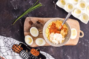 2. Make the filling – Mash the yolks with mayonnaise, Dijon mustard, vinegar, paprika, salt, and pepper until smooth. For a festive look, stir in orange food coloring or carrot puree until you achieve a pumpkin-like shade.