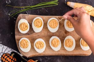 Fill the eggs – Spoon or pipe the filling back into the egg whites. Use a piping bag with a round or star tip to create a ridged, pumpkin-like shape.
