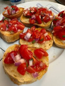 Top toasted baguette slices with a mix of diced tomatoes, garlic, olive oil, and fresh basil. These are vibrant, crunchy, and super flavorful.