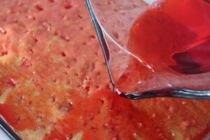 4. Pour the gelatin mixture evenly over the cake, letting it soak into the holes.